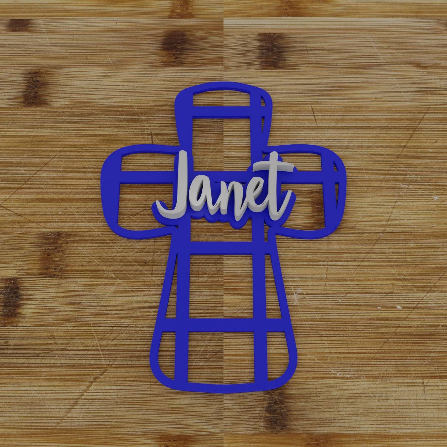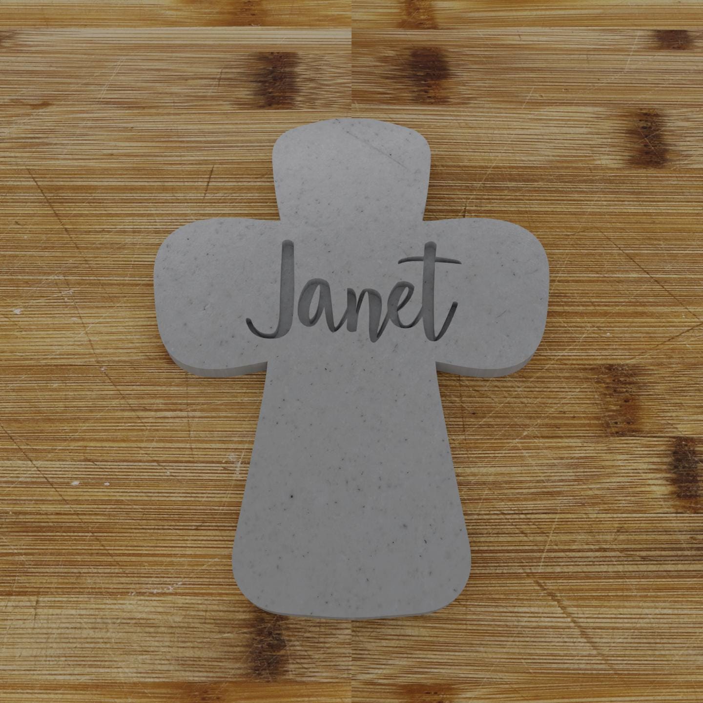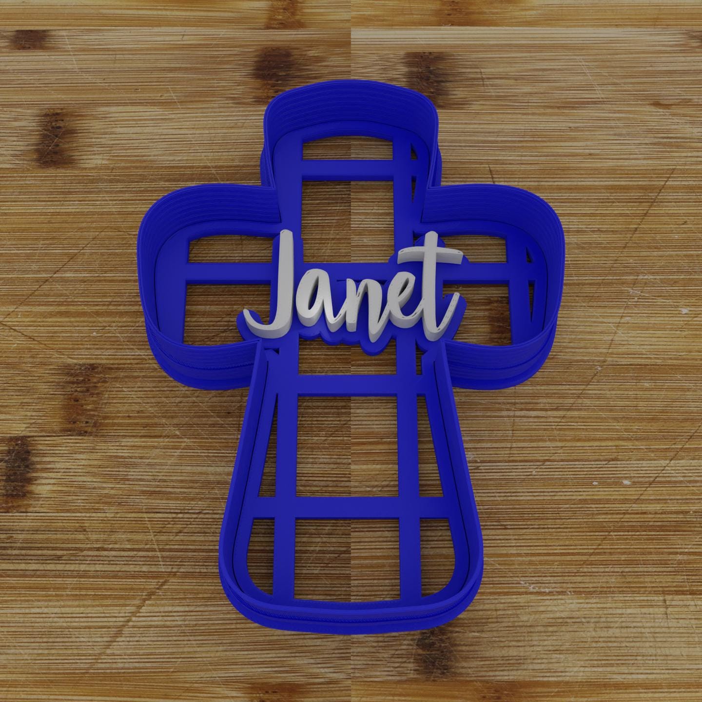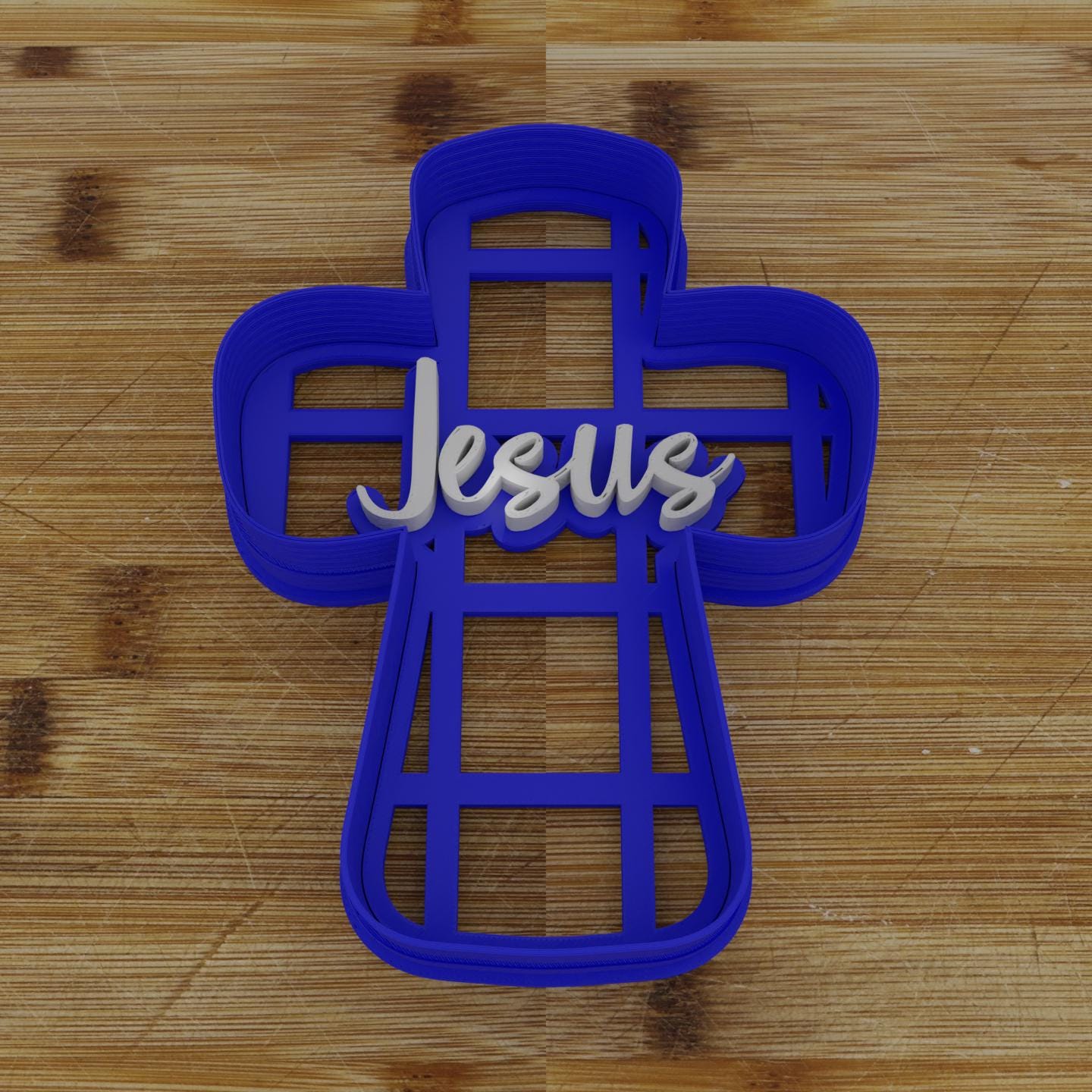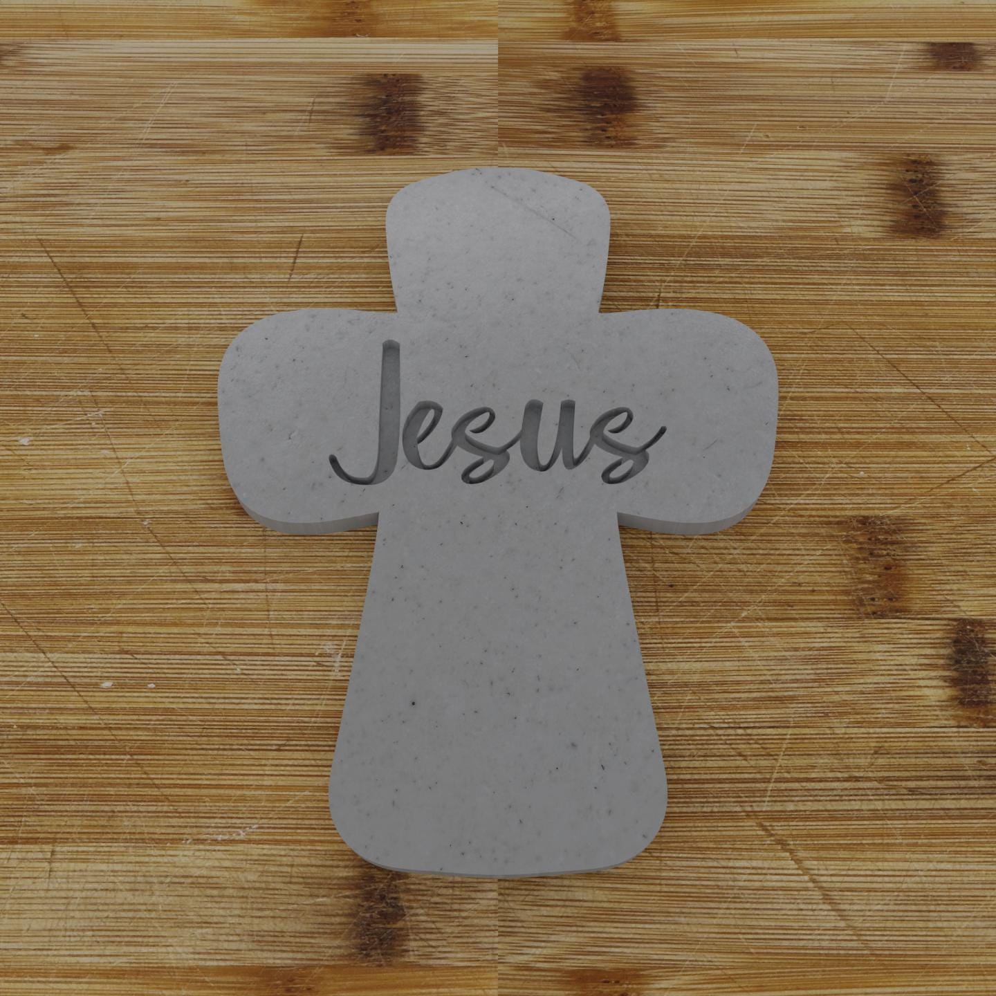 Cross-shaped cookie cutter and embosser combo, creating beautifully imprinted "Jesus" cookies for religious celebrations and gatherings. Please note that the Cutter/Embosser comes with "Jesus" on it, add personalization to change to any name.